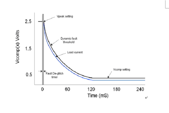 當(dāng)該特定通道處于“關(guān)閉”狀態(tài)時,經(jīng)過編程的 VPEAK(X) 值被反映在 VCOMP(X) 上。如果一個特定通道被開啟,那么過電流檢測的參考電壓就為動態(tài),并且用內(nèi)部 VPEAK 設(shè)置和VCOMP(X) 終端外部組件值表示。