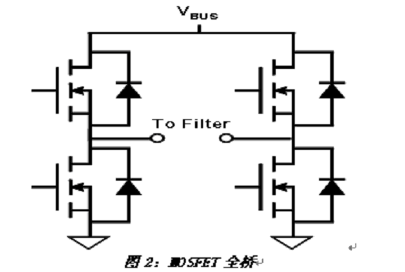 濾波之后,輸出橋產(chǎn)生一個(gè)50Hz的正弦電壓及電流信號。一種常見的實(shí)現(xiàn)方案是采用標(biāo)準(zhǔn)全橋結(jié)構(gòu) (圖2)。圖中若左上方和右下方的開關(guān)導(dǎo)通,則在左右終端之間加載一個(gè)正電壓;右上方和左下方的開關(guān)導(dǎo)通,則在左右終端之間加載一個(gè)負(fù)電壓。