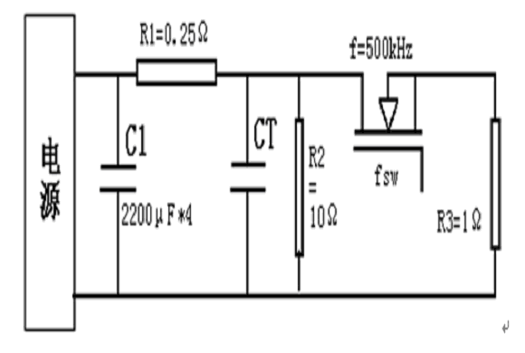 由于電子產(chǎn)品的工作電壓不斷地降低,而其功耗卻在增大, 這就要求DC/DC轉(zhuǎn)換器具有輸出電壓低和輸出電流高等特點(diǎn)。作為DC/DC轉(zhuǎn)換器或開關(guān)電源輸出電容,要求在開關(guān)管的工作頻率附近具有較低的紋波電壓。為了觀察PA-Cap在開關(guān)管一般工作頻率下的紋波電壓效果,進(jìn)行了如圖3所示的測試,其中的參數(shù)示于表1中。