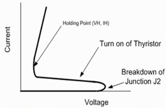 晶閘管的過壓保護設(shè)備是基于一對雙極性晶體管,這一對雙極性晶體管是由四層不同摻雜的N,P極組成,如圖1所示。N型摻雜的N1,P型摻雜的P1,和N型摻雜的N2分別構(gòu)成NPN晶體管的發(fā)射極,基極和收集極,而P型摻雜的P2,N型摻雜的N2,和P型摻雜的P1分別構(gòu)成了PNP晶體管的發(fā)射極,基極,和收集極。這樣一來一個晶體管的收集極是另外一個晶體管的基極。按這種方法那么一個晶體管的發(fā)射極到收集極流過的電流就是流向另一個晶體管的基極的電流。如果加一個從陽極到陰極的正電壓,那兩個三極管的發(fā)射極與基極之間,即J1和J3,都是正向電壓偏置。只有J2處PN結(jié)形成反向電壓偏置時才能阻礙電流流動。如果從陽極到陰極的電壓增加到大于J2處PN結(jié)的擊穿電壓,電流就開始直接流向兩個雙極性晶體管的基極。這使得兩個三極管都導(dǎo)通,會導(dǎo)致含有兩個三極管的晶閘管的電阻下降,并且晶閘管兩端的電壓也會減小。如圖2所示我們可以看到晶閘管的從陽極到陰極的正電流存在時的電壓-電流曲線。有著這樣的電壓-電流曲線特性的保護器件一定會有非常優(yōu)秀的保護特性。當保護器件在觸發(fā)后,工作電壓下降時保護器件可以承受大的電流并且自身功耗很小。事實上,具有這種電壓-電流曲線特性的保護器件通常被稱為“消弧”保護器件,因為這就好比是通過把一個“金屬消弧”放置在需要保護的端口來實現(xiàn)保護作用的。值得注意的是只有當電流或者電壓降到閾值點以下,才能使得晶閘管回到高阻態(tài),如圖2所示。