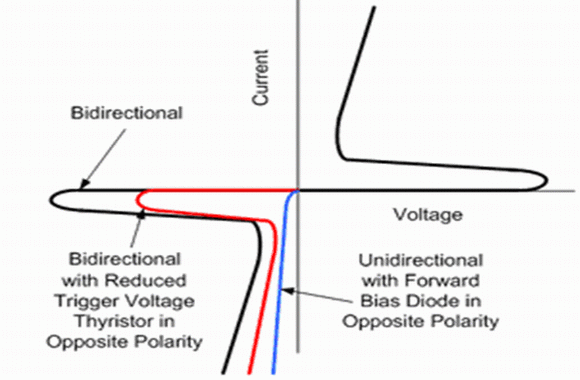 大多數(shù)晶閘管浪涌保護器件(TSPD)是對稱的雙向特性的,但也有內(nèi)含二極管單向特性的,如圖7所示。而不對稱的雙向晶閘管浪涌保護器件(TSPD)是在一個極性方向有著減小了的觸發(fā)電壓,如圖7所示。