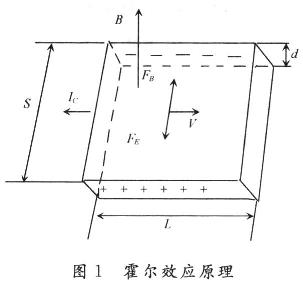 如圖1所示,一個N型半導(dǎo)體薄片,長度為L,寬度為S,厚度為d,在垂直于該半導(dǎo)體薄片平面的方向上,施加磁感應(yīng)強(qiáng)度為B的磁場,若在長度方向通以電流Ic則運(yùn)動電荷受到洛倫茲力的作用,正負(fù)電荷將分別沿垂直于磁場和電流的方向向?qū)w兩端移動,并聚集在導(dǎo)體兩端形成一個穩(wěn)定的電動勢UH,這就是霍爾電動勢(或稱之為霍爾電壓),這種現(xiàn)象稱為霍爾效應(yīng)?;魻栯妷旱拇笮H=RIB/d=KHICB,其中R為霍爾常數(shù);KH為霍爾元件的乘積靈敏度。