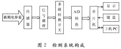 檢測系統(tǒng)構(gòu)成如圖2,被測量經(jīng)霍爾傳感器轉(zhuǎn)換為電壓信號,經(jīng)信號調(diào)理電路和多路轉(zhuǎn)換開關(guān)選擇,通過A/D轉(zhuǎn)換器送給單片機(jī),單片機(jī)采用89C51,是該系統(tǒng)的主控器,鍵盤選用2×4鍵盤,用于選擇被測量的種類,采用數(shù)碼管或液晶顯示被測量的大小。