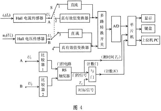由正弦交流電有功功率的定義P=UIcosψ可知,只要準(zhǔn)確測量出U,I及電流與電壓相位差ψ,就可算出P與cosψ。采用傳統(tǒng)的電磁式電壓、電流互感器進(jìn)行測量,由于互感器的非理想性,除存在變比誤差外,更主要的是存在較大的相位誤差,這就使測得的ψ值不能真實(shí)地反映負(fù)載的性質(zhì)。若采用霍爾電壓、電流傳感器及真有效值轉(zhuǎn)換器(如AD637)等,可以使功率及功率因數(shù)的測量精度大大提高。