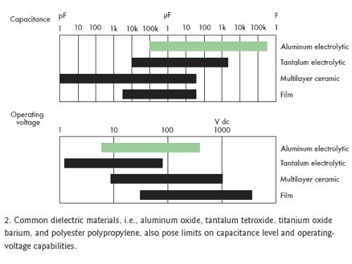[page]標(biāo)準(zhǔn)電容的結(jié)構(gòu)是在兩個(gè)附屬于金屬板上的電極之間夾一層電介質(zhì)層(圖1)。根據(jù)電容類型不同,電介質(zhì)可以是氧化鋁、四氧化鉭、氧化鈦鋇或聚丙烯聚酯,不同的材料決定了不同的容量和電壓特性(圖2)。電介質(zhì)的多少和極板間的距離也會影響電容量。然而,極板間最大允許距離限制了電介質(zhì)的數(shù)量。