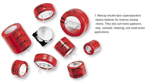 KanthalGlobar公司的Maxcap雙層電容器可以用來代替作為存儲器后備電源的電池,具有超過5.5F/in.3的容積效率、無限的服務(wù)壽命、快速充放電能力和非常低的漏電流等特性(圖7)。KanthalGlobar公司還表示,這些電容比電池更安全,在短路時(shí)不會爆炸,也不會損壞。這些電容器是非極化器件,不需要限流電阻或過壓保護(hù),因而可以消除裝配錯(cuò)誤和相關(guān)的成本。