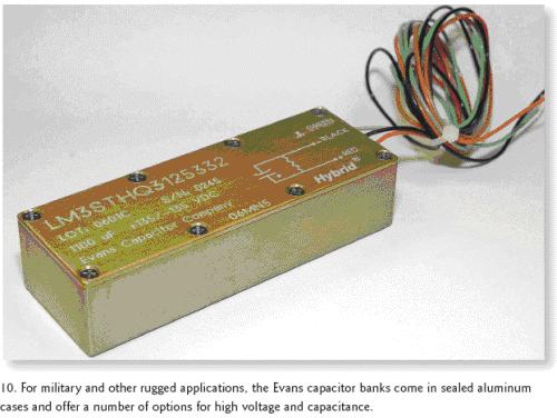 [page]EvansCapacitor公司的3STHQ3和3PTHQ3電容組器件則主要用于任務(wù)繁重的軍事應(yīng)用,它將公司的三個(gè)THQ3混合電容集成進(jìn)了一個(gè)陽極電鍍、環(huán)氧密封的鋁殼中,整個(gè)尺寸為4.47×1.59×1.09英寸(圖10)。針對更高的工作電壓,3STHQ3組可以串聯(lián)電容的方式提供以下四種產(chǎn)品:0.004F/160Vdc,0.0028F/200Vdc,0.0019F/250Vdc和0.0011F/300Vdc。
