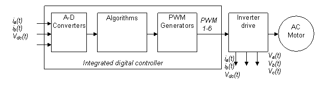 圖 1 是通用數(shù)字馬達(dá)控制系統(tǒng)的結(jié)構(gòu)簡(jiǎn)圖。算法可在數(shù)字控制器上實(shí)施,數(shù)字控制器生成的控制輸出可通過(guò)逆變器驅(qū)動(dòng)馬達(dá)。電流及電壓測(cè)量等反饋信號(hào)通過(guò)模數(shù)轉(zhuǎn)換器 (ADC) 反饋至該算法。