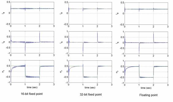 要比較三種數(shù)據(jù)格式對(duì)數(shù)值精度的影響,需要監(jiān)控估計(jì)速度響應(yīng)與相應(yīng)的d 及q 軸參考電流。將所有的PI 增益、參數(shù)、基本量在全部三種數(shù)據(jù)格式的仿真過(guò)程中設(shè)定為相同的有效值。從圖4 可以看出,16位定點(diǎn)版本與浮點(diǎn)版本的性能具有極大的差別。