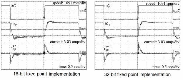 比例積分控制器的積分項(xiàng)總是采用 32 位字長甚至是 16 位定點(diǎn)版本,根據(jù)以往的經(jīng)驗(yàn),采用 16 位積分累加的結(jié)果明顯地差的多。采用類似仿真的策略將 ±0.5 pu 的步長應(yīng)用于系統(tǒng)速度參考。d 軸及 q 軸電流和估測(cè)速度作為速度命令的步長,這些也證實(shí)了仿真結(jié)果。在瞬態(tài)及穩(wěn)態(tài)狀態(tài)下,仿真結(jié)果的響應(yīng)相關(guān)性很強(qiáng)。不良振蕩瞬態(tài)及因采用 16 位實(shí)施造成的瞬態(tài)時(shí)間增加等情況下的量化效應(yīng)是可以驗(yàn)證的。