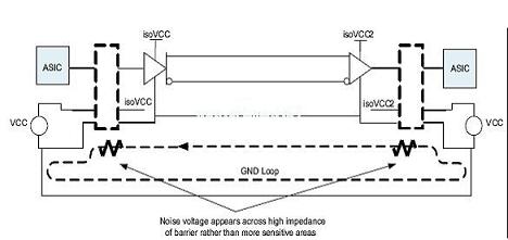 如圖4所示,通過相對(duì)于其他電路組件而言的高阻抗,隔離中斷了由電路通路形成的環(huán)路。通過中斷該環(huán)路,噪聲電壓出現(xiàn)在隔離層上,而非出現(xiàn)在接收機(jī)或更為敏感的組件上。噪聲電壓的高電平可以由外部電流或電壓源(例如:電感馬達(dá)和閃電(lightning))耦合。[page]