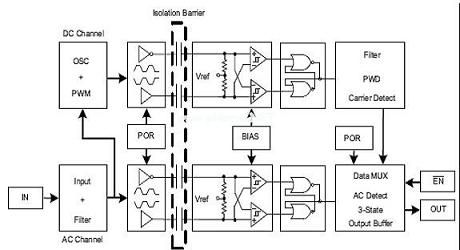 為了提供恒定信息的傳輸,ISO72x使用一個(gè)高信號(hào)速率和低信號(hào)速率通道來進(jìn)行通信,如圖9所示。高信號(hào)速率通道未被編碼,并且其在一個(gè)單端到差分轉(zhuǎn)換之后的隔離層上傳輸數(shù)據(jù)。該低信號(hào)速率通道以一種脈寬調(diào)制格式對(duì)數(shù)據(jù)進(jìn)行編碼,并在隔離層上差分傳輸數(shù)據(jù),從而確保了恒定狀態(tài)的精確通信(1和0的長(zhǎng)字符)。