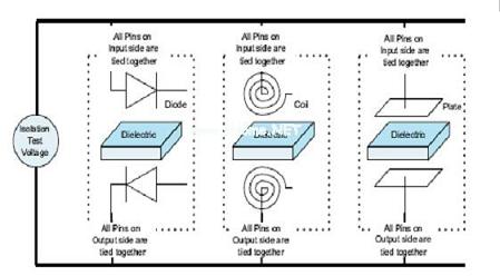 三個(gè)主要標(biāo)準(zhǔn)驗(yàn)證了對(duì)于隔離保護(hù)的必要性,其分別為UL1577、IEC60747-5-2和CSA。雖然每一種標(biāo)準(zhǔn)都稍有不同,但是均提供了一個(gè)對(duì)比隔離性能的標(biāo)準(zhǔn)。IEC、UL和CSA的測(cè)試證實(shí)了輸入和輸出之間電介質(zhì)擊穿以外的電壓。運(yùn)用這些標(biāo)準(zhǔn)非常簡(jiǎn)單,因?yàn)闇y(cè)試標(biāo)準(zhǔn)和隔離方法無關(guān)。圖10顯示了隔離測(cè)試是如何將隔離器看作是兩端器件的。盡管每種器件的物理結(jié)構(gòu)存在差異,但隔離測(cè)試卻是在電介質(zhì)擊穿電壓上測(cè)定的。