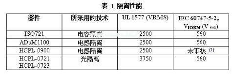 UL1577、IEC60747-5-2、IEC61010-1和CSA測(cè)試了ISO72x系列隔離性能。表1顯示了說明該三種隔離技術(shù)的這五個(gè)器件的隔離性能。