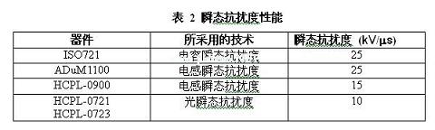 在電容耦合解決方案中,法拉第屏蔽并非是一種可行的解決方案。除了瞬態(tài)以外,法拉第屏蔽還會(huì)阻塞用于數(shù)據(jù)傳輸?shù)碾妶?chǎng)。為了提供瞬態(tài)抗擾度,ISO72x系列電容隔離器只傳輸fo信號(hào)(信號(hào)中僅代表最高頻率能量的數(shù)據(jù)信號(hào))。這樣就允許有一個(gè)噪聲頻率高阻抗的小耦合電容。其他噪聲則來自在隔離層上傳輸數(shù)據(jù)的差分技術(shù)。圖9顯示了穿過電容隔離層的四個(gè)信號(hào);兩個(gè)包含低信號(hào)速率信息,另外兩個(gè)包含高信號(hào)速率信息。通過使用差分技術(shù),可以在真正的和補(bǔ)償信號(hào)中看到任何穿過隔離層的剩余共模瞬態(tài),而且差分接收機(jī)對(duì)其進(jìn)行了抑制。如表2所示,ISO72x系列的瞬態(tài)抗擾度和所有具可比性的高達(dá)25kV/us的器件一樣高。[page]