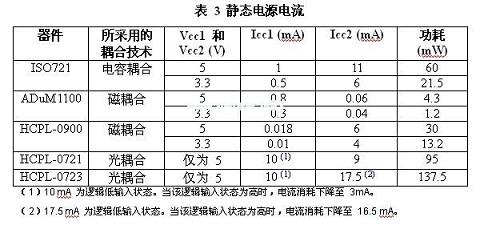 除了隔離層上信號(hào)傳輸?shù)男手?,輸入和輸出調(diào)節(jié)電路的設(shè)計(jì)同功耗的相關(guān)性最大。如表3所示,與電感或電容實(shí)例相比,光耦合器的功耗會(huì)更高。