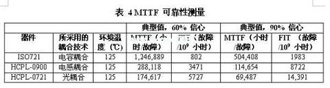 故障前平均工作時(shí)間(MTTF)是半導(dǎo)體設(shè)備可靠性的標(biāo)準(zhǔn)測(cè)量方法。對(duì)于數(shù)字隔離器而言,這種測(cè)量表示集成電路和隔離機(jī)制的可靠性。表4顯示了一款光、電感和電容數(shù)字隔離器的MTTF。與電感及光解決方案相比,ISO721非??煽?。