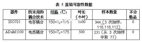 ADuM1100可靠性數(shù)據(jù)表沒有明確地說明MTTF,但是其提供了可靠性測(cè)試的結(jié)果。表5顯示了ISO721和ADuM1100可靠性測(cè)試的參數(shù)。