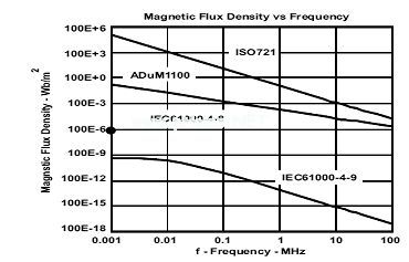 圖12對(duì)比了ADuM1100和ISO72x(沒有找到HCPL-0900的數(shù)據(jù))的磁場(chǎng)抗擾度。相對(duì)來說盡管這兩個(gè)實(shí)例均對(duì)磁場(chǎng)有一定的抗擾度,但是ISO72x提供了更大的裕度。如前面所述,光耦合隔離層電路對(duì)外部磁場(chǎng)具有內(nèi)在的磁化抗擾度。