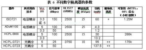 噪聲降低和噪聲保護(hù)使得隔離器在那些隔離器中斷接地環(huán)路并將接地電壓差隔離的電子電路中得到廣泛使用。設(shè)計(jì)人員現(xiàn)在擁有許多用來進(jìn)行數(shù)字信號(hào)隔離的選擇,包括TI推出的ISO72x系列,其在信號(hào)速率、電介質(zhì)擊穿電壓、瞬態(tài)抗擾度、功耗、磁場(chǎng)抗擾度以及可靠性等重要特性方面均表現(xiàn)不俗。表6對(duì)本報(bào)告中所討論實(shí)例的這些特性進(jìn)行了總結(jié)。