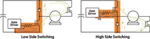 在圖1中,電壓源變頻器的臨界電流路徑被標為紅色陰影,其特征是di/dt變化率高,這個特征也表現(xiàn)在對應的柵極驅(qū)動電路上。要保證柵極驅(qū)動電路安全的工作,就要最大限度地減小雜散電感。尤其是高壓側(cè)柵極驅(qū)動電路,存在一個由低壓側(cè)二極管和電流通道上的阻性和感性壓降所引起的,且幅度超過VS最小允許電壓的負壓,會導致電路工作異常。