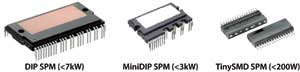 為了克服以上約束,最好采用智能功率模塊(intelligentpowermodule(IPM),也稱為SmartPowerModule(SPM®))。圖2所示為一個典型的全封閉模塊,它包含一個完整的三相電壓源變頻器,以及相應的柵極驅(qū)動器和保護電路。采用這種模塊比分立元件方案節(jié)省電路板空間多達50%。尤其是這種模塊需要的外接部件極少,在設計上就考慮了EMC的要求。其峰值和平均EMC干擾強度比傳統(tǒng)設計低很多。