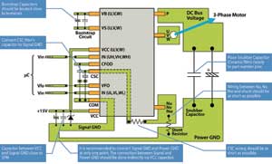 與電壓源變頻器的分立元件方案類似,采用智能功率模塊時也要注意外部元件的布局安排。圖3所示為針對Motion-SPMTM應用的一些建議。由于電壓源變頻器的開關速率很快,信號接地和功率接地必須分開。兩種接地在15VVcc電容處互接。Vcc電容和功率接地之間的通道要狹窄,以去除耦合。為防止電涌造成破壞,引腳P與功率接地之間應當有一個低電感電容。另外,由于電壓源變頻器和馬達之間的長引線會造成高壓反射,因此一些SPM產(chǎn)品配備了外接柵極電阻來調(diào)節(jié)開關速率和最大限度地減少反射。