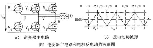 實(shí)現(xiàn)無刷直流電機(jī)電子換相及PWM控制的逆變器主電路如圖1a所示。采用兩兩通電方式,即每一個(gè)瞬間有兩個(gè)功率管導(dǎo)通,每隔60°電角度換相1次,每一功率管導(dǎo)通120°電角度。功率管的導(dǎo)通順序是:V6V1→V1V2→V2V3→V3V4→V4V5→V5V6。