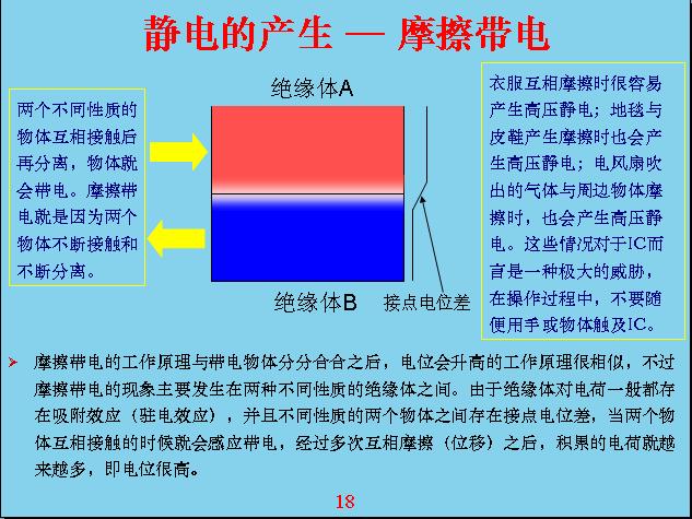 舉一個具體的例子,比如說我現(xiàn)在這個人站在地上,我是光著腳,地板是導電的,這個椅子是絕緣的,我從地面一站到椅子上就相當于我?guī)щ娏恕槭裁??因為我原來是極化帶電,上面帶負電,下面帶正電,我站在地上下面就變成零,上面變成了-100v,站上去的時候相對來說我就變成帶電的人。所以,很多在半導體車間或者和集成電路接觸、打交道的人,不要隨隨便便用人摸集成電路,因為你這個人不知不覺就帶電了,你從門外面走進房子里很可能就帶電了,在上樓梯或者地板鋪有一層絕緣的東西,在絕緣以外的時候你不帶電,站上去就帶電了,因為上面有電層。還有空調的風吹出來的空氣會和你身體上面的衣服進行摩擦、感應,它容易帶電,用靜電筆來測,隨便碰衣服或頭發(fā),上面帶的電基本上都有300v左右,如果摩擦幾下大概就有4000-5000v,所以靜電感應是相當厲害的,很多模型電路在送到工廠的時候就是用盒子包裝,因為盒子是導電的,如果用電表去量它好像沒有電阻,電阻是無窮大,其實它是導電的,相對來說電導率很低,也就是電阻很大。