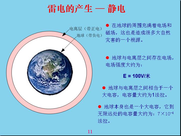為什么會產生雷電?可能大部分人都不知道,我在這里就給大家講解一下雷電是怎么產生的。雷電是由于電磁場產生的,世界上什么電都是通過電磁場反應產生的。為什么會產生雷電呢?因為在離地球30公里外有一個電離層,電離層實際上就是最外的空氣受到太陽光、紫外線照射而產生電離,太陽光實際上也是一種電磁波,電磁波的作用相當于我們把一個食物放在微波爐里面加熱,原理是差不多的,但是微波的波長線很長,紫外線相當短,所以作用不一樣,用微波爐不能把空氣進行電離,只有紫外線能夠電離。被電離以后會分成兩層,一層帶正電,一層帶負電,與地球相對的一層帶正電,地球就是帶負電。地球是一個圓的,帶電的話相當于電層強度是散發(fā)性的,越靠近地球電容強度越高,靠近地球表面是100v,也就是說一米高的位置電容強度是100v電容強度就是用這個來表示,大家在中學里面很少用電位梯度的概念表達電容強度,后面我們在工作中還是用電位梯度來表示電容強度是最合適的,比如靈敏度、多少毫伏米都是屬于電感強度。以前是用牛頓的力學來表達,那個概念相對來說比較難理解,兩個帶電物體之間產生多少牛頓力的時候,換算成單位來表示電容強度,這個強度不太好理解,如果用電位梯度表示就很方便了。