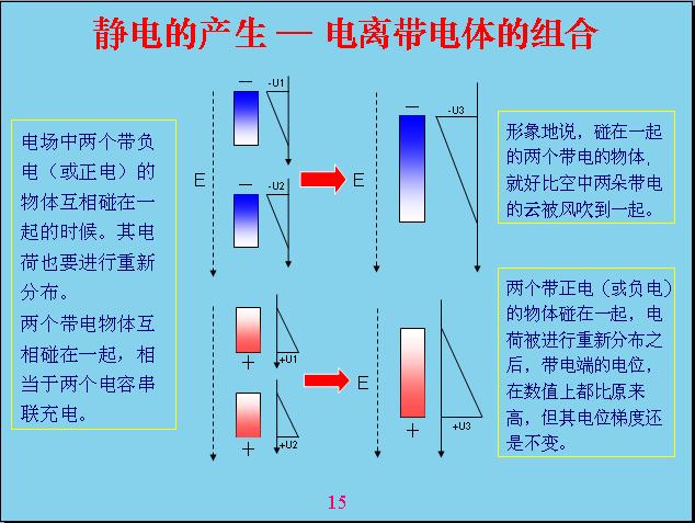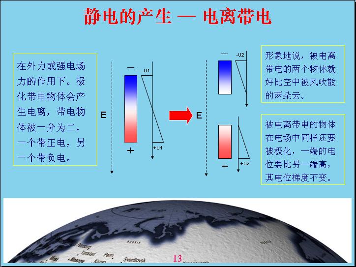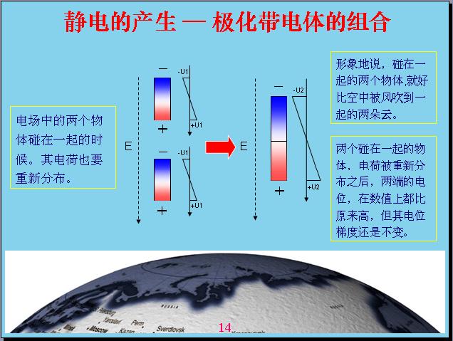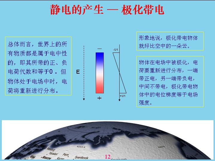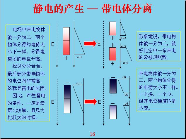 由于地球是帶電的,相對電容層來說。一個物體在地球空間里面就會受到電場的作用產生極化,什么叫極化?就是說一個物體原來是不帶電的,現(xiàn)在產生極化帶電,一端帶正電,一端帶負電。比如說這個源相當于一個導體,如果底下是絕緣的話,上面如果沒有屏蔽,我的上面就帶負電,下面帶正電,中間這個地方是不帶電的,人相對來說還是偏中性,但是雖然極化帶電的,但我總得來說還是變中性,帶的正電和負電都是相等的。如果把原來極化帶電的物體分成兩個,這兩個都會帶電。形象地說,一朵云在電場作用下極化帶電,但沒有產品電流,電感強度沒有達到這么高,如果把它分成兩塊就會產生電容帶電。現(xiàn)在由于風的作用,把它一吹變成兩塊,中間的地方分成兩塊,有一塊相當于帶負電,有一塊帶正電。這就表示電位曲線,中間這個地方表示電位反映,上面帶負電,下面帶正電,這個幅度越高表示帶電幅度也越高。這個沒有帶正電,那個沒有帶負電,電容性就破壞了,相對來說是帶負電,這個帶正電的。云帶電就是因為這樣產生的。