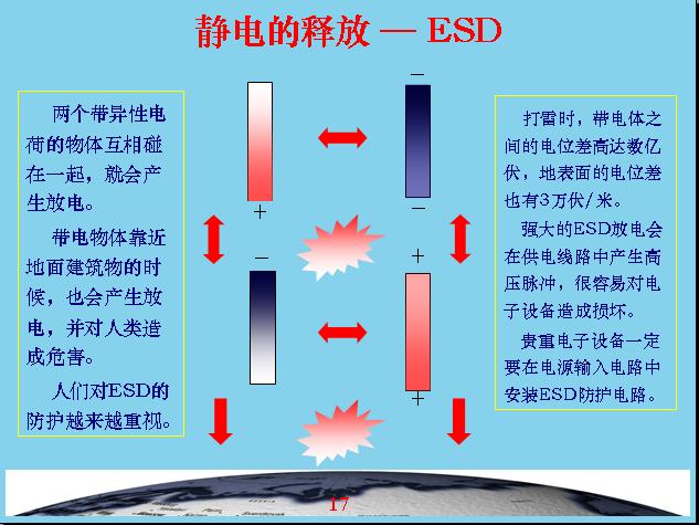 剛才跟大家介紹一下什么叫雷電和ESD,ESD就是靜電放電,雷電也屬于靜電放電,所以大家都知道ESD的危害性有多大。地球每秒鐘大概就有100多次閃電,每閃電一次能量就可以提供100w的燈泡供我們用3個月,在雨季平均每6分鐘就有一個人被雷電擊中,中國還不是受雷電受害最集中的地區(qū),在非洲這些地區(qū)受雷擊更嚴重,上海電視塔平均每年要遭受33次大的雷擊,今年4月13日上海電視臺電子設備遭受不同程度的雷擊,天線站玻璃鋼都起火了,變成一個大火球燒起來了。還有一次是1992年在北京國家氣象中心也受到雷擊,損失了2000多萬元。在全世界每年受雷電擊壞的設備都是以千萬為單位,每年遭受的損失都是上千億。我們現(xiàn)在使用的電子設備價格越來越高,對防雷的要求也越來越高。