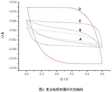 采用三電極體系,即由上述電極作為工作電極,氯化亞汞作為參比電極,大面積鉑黑電極作為輔助電極組成三電極系統(tǒng)。電解質(zhì)采用6mol/L的KOH溶液,掃描速度為2mV/S,電位范圍為-0.4V~+0.6V。
