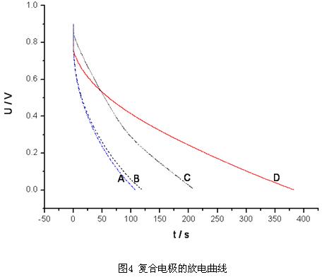 圖4給出了各電極在恒定電流為2mA的情況下的放電曲線,可以看出各電極均具有良好的線性放電性質(zhì)。由公式(1)計(jì)算得出A、B、C和D四種電極材料的比電容分別為51.3F/g、56.2F/g、93.2F/g和126F/g。由上節(jié)分析可知,雙電層和法拉第贗電容的共同作用,提高了活性炭/二氧化錳復(fù)合電極的容量,同時(shí)也表現(xiàn)出了良好的放電特性。在對(duì)電容容量的貢獻(xiàn)上,二氧化錳的作用要優(yōu)于碳納米管。