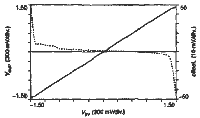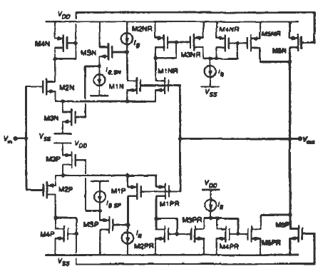在中部電源電壓區(qū),PMOS和NMOS輸入對是有效的,而且它們的偏置電流通過電流鏡M4P--M5P和M4N--M5N鏡像到該電路的輸出端。這種結(jié)構(gòu)允許NMOS輸入對驅(qū)動在電源電壓區(qū)的輸出節(jié)點接近VDD.而PMOS控制輸出端的電壓范圍接近VSS.不幸的是,在接近VDD時,P溝道輸入對截止,而且沒有電流被鏡像到輸出端的底部,關(guān)閉了緩沖器。類似的情況是VSS時.N溝道差分對不是有效的。為了這個原因,晶體管M1PR-M5PR和MlNR-M5NR已包括在圖2中,維持在整個電壓范圍內(nèi)是有效的。