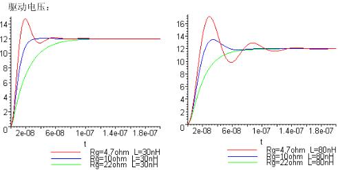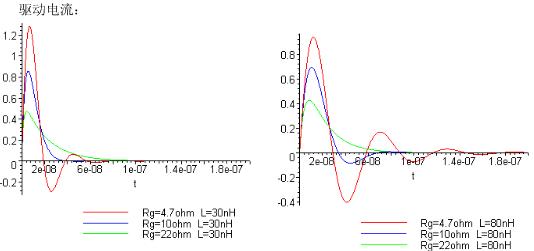 關(guān)于Rg、L對于上升時(shí)間的影響:(Cgs=1nF,VCgs=0.9*Vdrive)