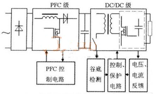 所研究的開關電源結(jié)構(gòu)如圖1所示,采用兩級PFC結(jié)構(gòu),由PFC預變換器、隔離變換器和同步整流電路組成的DC/Dc變換器以及檢測與保護電路組成。交流電壓經(jīng)整流后先輸入到PFC預變換器進行功率因數(shù)校正變換,再由電源控制電路控制隔離變換器,將直流電壓轉(zhuǎn)換成高頻交流脈沖電壓,此脈沖電壓經(jīng)同步整流器整流、濾波電路濾波后,得到所需的直流。