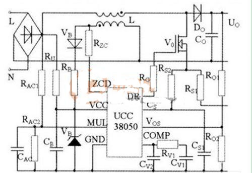功率因數(shù)校正電路原理如圖4所示。電路中,電感L、功率MOS開關管Vo、二極管Do和電容Co組成Boost變換器。電阻分壓器RAc1和RAc2對輸入電壓波形取樣,獲得輸入電壓前饋信號,作為控制芯片UCC38050內(nèi)部乘法器的一個輸入,與電源反饋信號一起生成電感電流參考信號。電阻Rzc將電感電流過零信號輸入芯片,以控制開關管零電流開通。電阻Rs1檢測開關管電流,輸出電壓經(jīng)Ro1和Ro2分壓后反饋給芯片。這些信號輸入芯片后,經(jīng)過UCC38050內(nèi)部運算與控制,形成PWM控制信號,控制開關管通斷,使電流波形跟蹤電壓波形,實現(xiàn)功率因數(shù)校正。