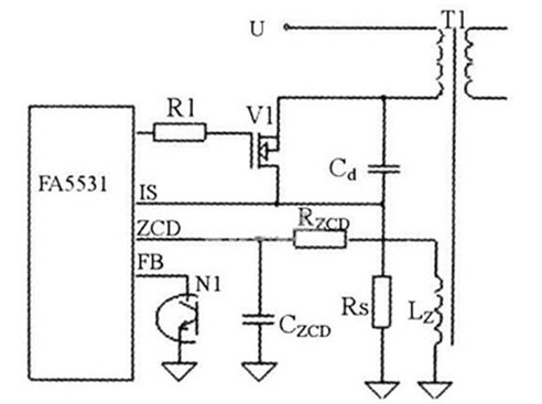 功率隔離變換器電路如圖5所示,由控制電路和反激式變換器組成。圖中,變壓器輔助繞組LZ、電阻RZCD、電容CzcD組成谷底探測電路,為控制芯片F(xiàn)A5531提供谷底檢測信號。光電耦合器N1次級將輸出電壓反饋信號輸入控制芯片。電路啟動后,F(xiàn)A5531輸出驅(qū)動信號使V1導通,V1電流上升,此電流由Rs檢測輸入到控制芯片的IS引腳,與由反饋輸入FB引腳的電壓決定的參考電壓進行比較,達到參考電壓時,V1關斷,變壓器繞組電壓反相,變壓器初級電感向次級負載饋送能量。當向次級饋送能量過程結(jié)束時,次級電流下降到零。變壓器漏感與開關管寄生電容Cd構(gòu)成了諧振電路,變壓器輔助繞組感應此諧振電路的諧振電壓,并輸入到FA5531P的ZCD引腳。當次級電流下降到零時,諧振電路的諧振電壓迅速下降,輔助繞組的感應電壓也迅速下降,當ZCD引腳上的電壓降至谷底探測閾值時,F(xiàn)A5531P驅(qū)動輸出使V1重新導通。由于電阻RzcD、電容CzcD會引入延時,選擇合適的RzcD、CzcD值,就可實現(xiàn)V1零電壓開通。