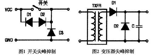 圖1中的二極管用于抑制高壓開關(guān)的尖峰電壓。圖2是典型的變壓和整流電路,D2是肖特基或齊納二極管,用于抑制濾波后的尖峰瞬態(tài)噪聲電壓。