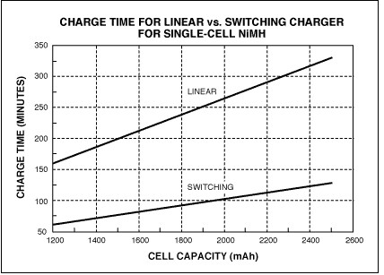 圖6. 對單節(jié)NiMH電池充電時,線性充電器和開關充電器的充電時間不同