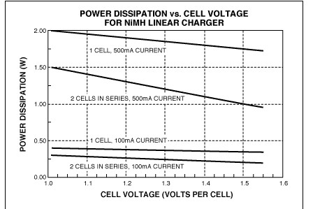 圖5. 采用5.0V電壓的USB端口對NiMH電池充電時,線性調整器件的功耗[page]