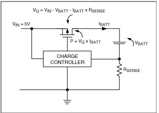 USB 2.0規(guī)范允許低功率端口提供最大100mA電流,大功率端口提供最大500mA電流。如果采用線性調整器件來調節(jié)電池充電電流,這也就是最大可提供的充電電流。線性調整器件(圖4)的功耗為P = VQ x IBATT。這會造成調整管發(fā)熱,可能需要安裝散熱器,以防止過熱。