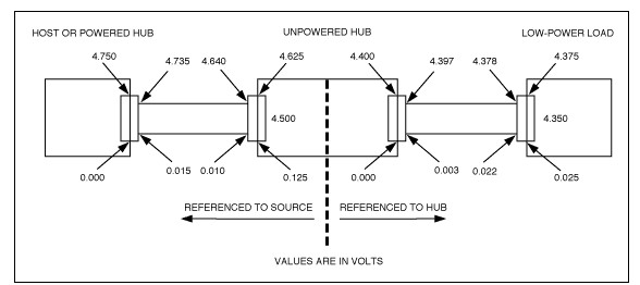 當USB端口帶有一個總線供電的USB集線器,集線器上接了低功耗設備時,USB口上允許的直流電壓跌落如圖1所示。大功率負載與總線供電的集線器連接時,電壓跌落將超過圖1給出的指標,并會引起總線過載。