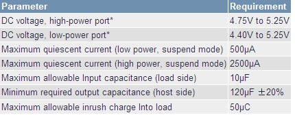 在符合USB 2.0規(guī)范的主機中,大功率端口的上游端具有120uF、低ESR電容。所連接的USB設備的輸入電容限制在10?F以內,在最初的負載連接階段,允許負載從主機(或自供電集線器)吸取的最大電荷數(shù)為50?C。這樣一來,當新設備連接至USB端口時,上游端口的瞬態(tài)電壓跌落小于0.5V。如果負載正常工作時需要更大的輸入電容,則必須提供浪涌電流限制器,以保證對更大的電容充電時電流不會超過100mA。