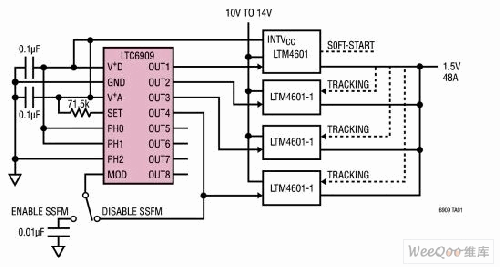 硅振蕩器為多相、擴(kuò)頻開(kāi)關(guān)穩(wěn)壓器時(shí)鐘提供了一個(gè)理想的平臺(tái)。除了具有一個(gè)板上時(shí)鐘發(fā)生器之外,這些固態(tài)器件還能將擴(kuò)頻調(diào)制與多相輸出組合起來(lái)。考慮到這一點(diǎn),凌力爾特公司開(kāi)發(fā)出了LTC6909(圖1),這是一款具有8個(gè)單獨(dú)多相輸出的精準(zhǔn)擴(kuò)頻硅振蕩器。單個(gè)電阻器負(fù)責(zé)在12.5kHz至 6.67MHz的范圍內(nèi)選擇輸出頻率。三個(gè)邏輯輸入用于設(shè)定輸出相位關(guān)系(范圍從45°至120°),從而允許LTC6909為多達(dá)8個(gè)相位提供同步??梢詥⒂靡环N偽隨機(jī)擴(kuò)頻調(diào)頻,頻率擴(kuò)展量在中心頻率的±10%。用戶可選擇3種調(diào)制速率之一,以確保調(diào)制速率不超過(guò)穩(wěn)壓器的帶寬。此外,LTC6909還具有一個(gè)創(chuàng)新的濾波器,該濾波器負(fù)責(zé)跟蹤SSFM調(diào)制速率并在頻率轉(zhuǎn)換之間提供平滑處理。
