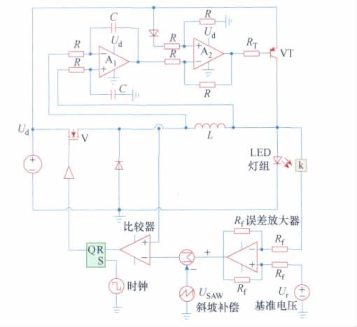 本文提出一種有源紋波補償BUCK 型LED 驅(qū)動電路。該電路無需使用大容量電解電容,所需要的小容量電容可以采用能量密度較小的新型長壽命電容,利用有源補償技術(shù)抑制輸出紋波電流。由于取消電解電容的使用,可以使電路壽命增長,穩(wěn)定性提高,便于集成,電路易小型化。