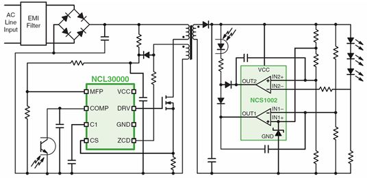 要針對低功率LED照明應用提供高于0.9的功率因數(shù)及低總諧波失真,以適合商業(yè)應用要求,就有必要使用新的拓撲結(jié)構(gòu)。在這種情況下,可以使用基于NCL30000臨界導電模式(CrM)反激控制器的單段式CrM反激拓撲結(jié)構(gòu)。單段式拓撲結(jié)構(gòu)省下專用的PFC升壓段,幫助減少元器件數(shù)量,降低系統(tǒng)總成本,并提供高功率因數(shù)。圖8顯示的是基于NCL30000的單段式高功率因數(shù)反激拓撲結(jié)構(gòu)的簡化功能框圖。