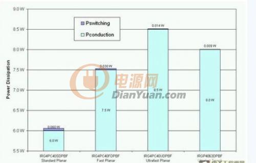 低壓側(cè)IGBT同樣有同一問題。究竟哪一種IGBT才能提供最低的功耗?由于這些IGBT只會(huì)進(jìn)行 50Hz或60Hz切換,如圖5所示,標(biāo)準(zhǔn)速度IGBT可提供最低的功耗。雖然標(biāo)準(zhǔn)IGBT會(huì)帶來一些開關(guān)損耗,但數(shù)值并不足以影響IGBT的總功耗。事實(shí)上,最新的槽柵IGBT仍然擁有較高的功耗,因?yàn)檫@一代的槽柵IGBT專門針對(duì)高頻率應(yīng)用而設(shè)計(jì),以平衡開關(guān)和導(dǎo)通損耗為目標(biāo)。因此,對(duì)低壓側(cè)IGBT 來說,標(biāo)準(zhǔn)速度平面式IGBT仍然是必然選擇。