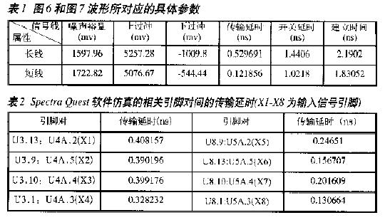 檢測器的每個信號應(yīng)盡可能保持同一傳輸延遲,這就要求布線時盡量保持長度一致,對于微弱的差別,可以根據(jù)仿真結(jié)果延長或縮短布線。完成布線以后,再利用Spectra Quest軟件仿真輸入信號的傳輸延遲,具體參數(shù)如表2所示??梢钥闯?,其相對延時不超過0.2ns,仿真結(jié)果比較理想。